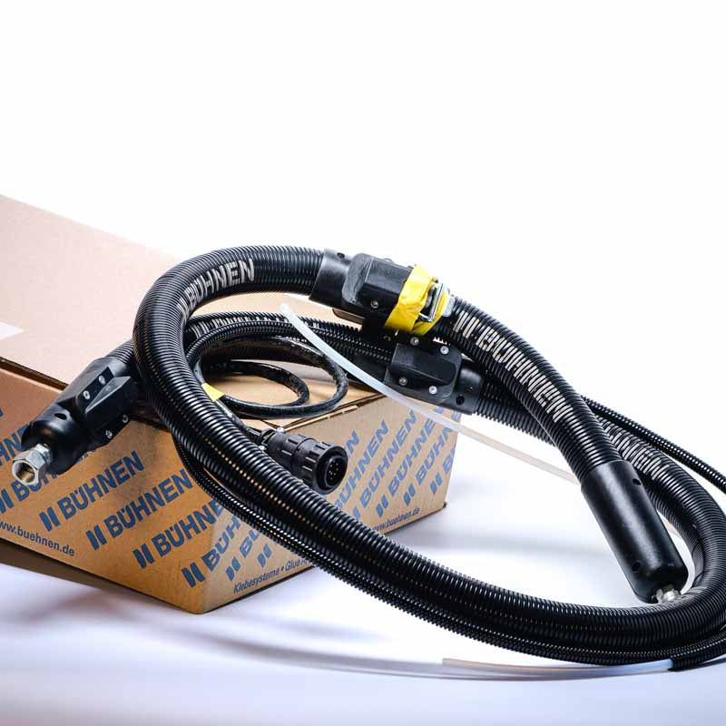 The used heated hose has a length of 1.8 meters. It serves as a heated and flexible transport route for hot melt adhesives from the melting device to the handheld device