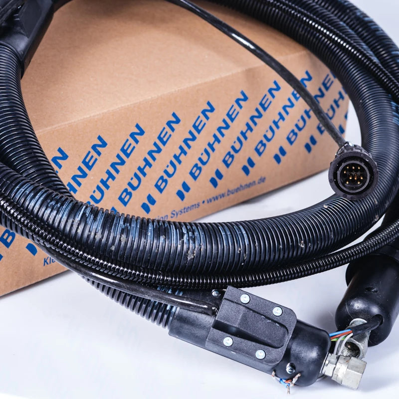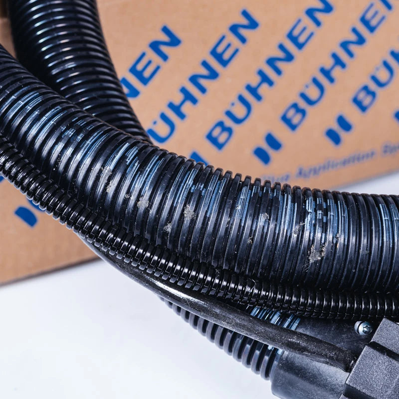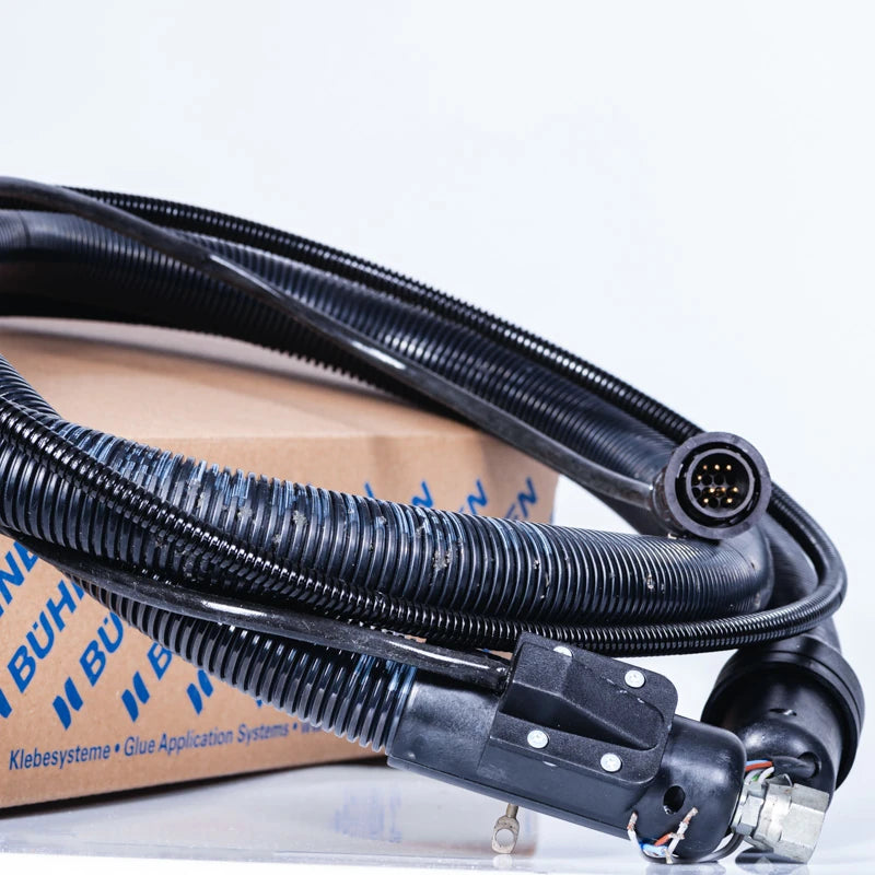 Der gebrauchte heizbare Schlauch für den manuellen Auftrag hat eine 2,4 Meter Länge. Er dient als beheizter und flexibler Transportweg für Schmelzklebstoffe, von einem Schmelzgerät zu einer Handpistole HB 910 Spray.